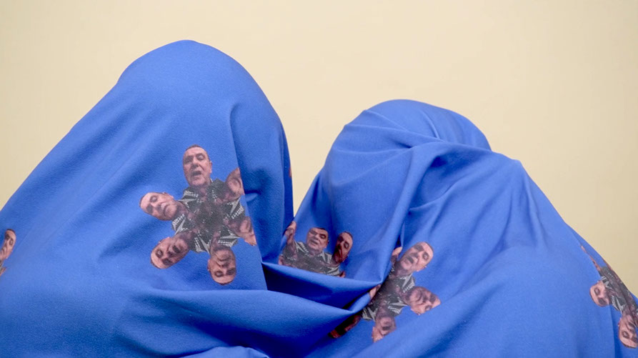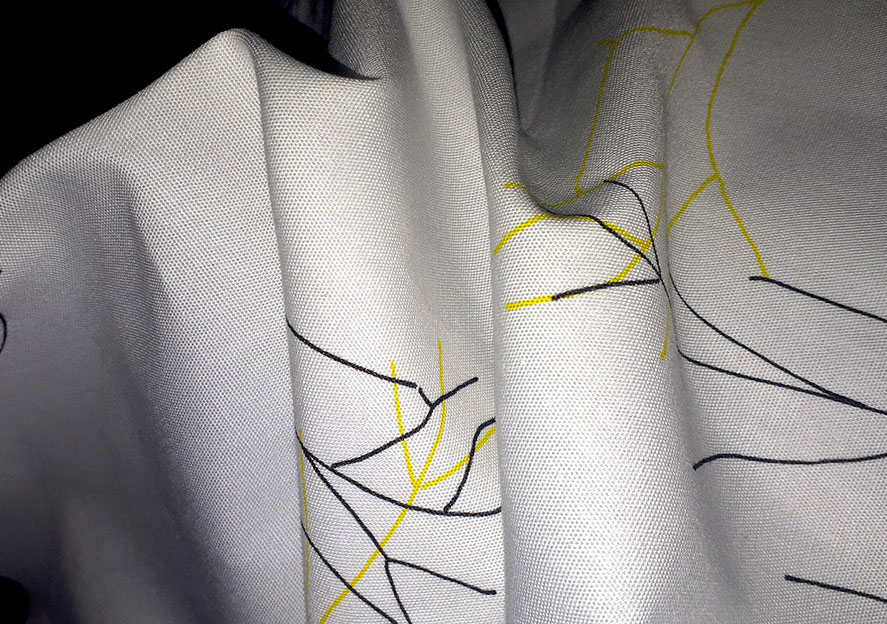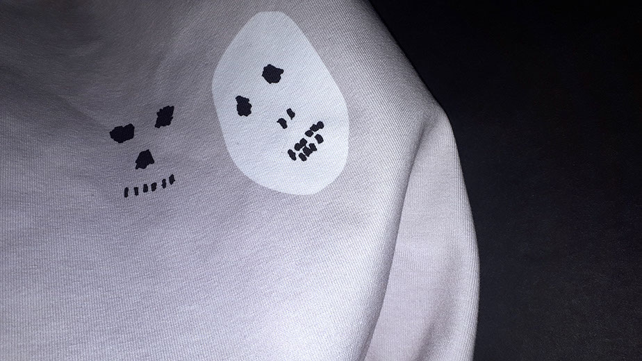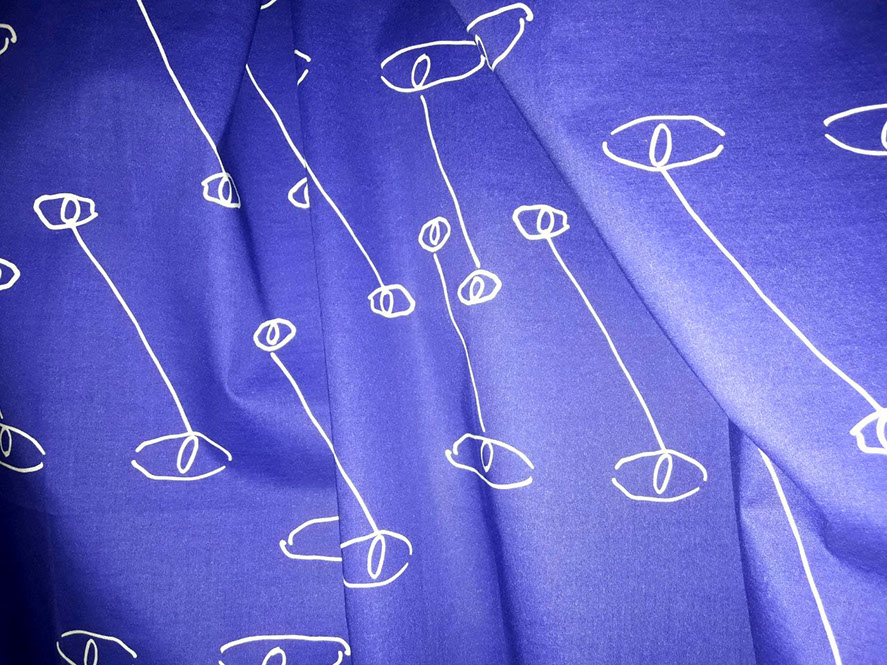 Commercially printed cotton/elastane cloth, dimensions variable. With graphic design support from Christian Ertel. Centered around ideas of loss, memory and haunting, Ghosting is a series of printed cloths that are both exhibited on their own, and shown covering figures in the videos. The cloth in the exhibition space is real and tactile; in the videos, it shrouds whoever is beneath it. Dreams and memories, both of the living and the dead, are the subject of the designs, but Ghosting also speaks to the ephemeral nature of photo and video recordings.