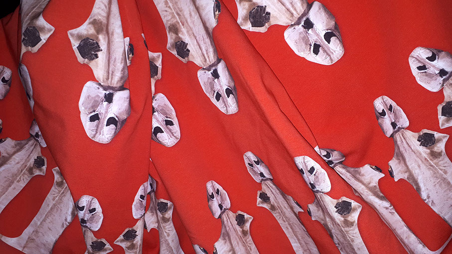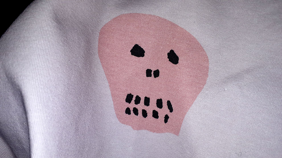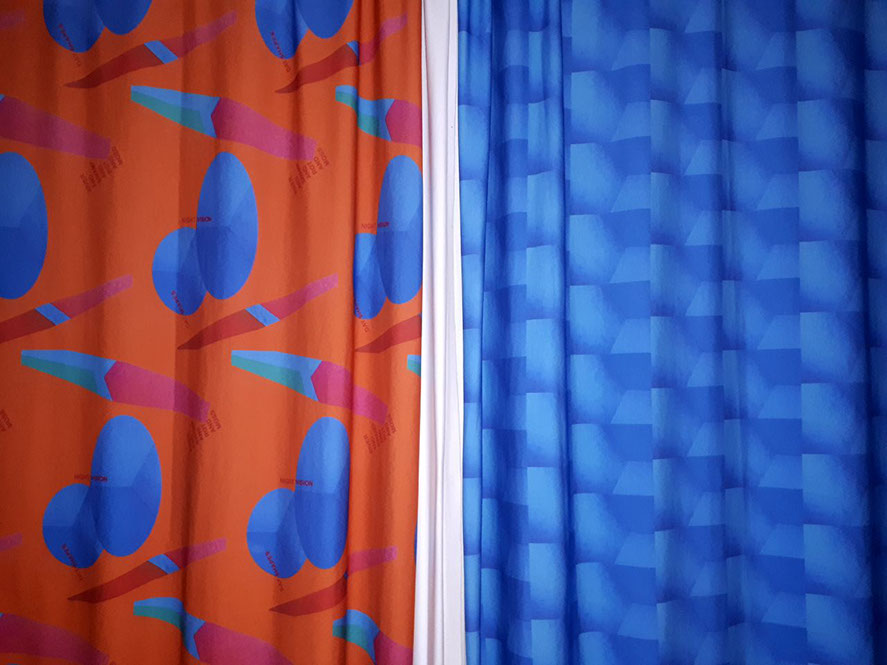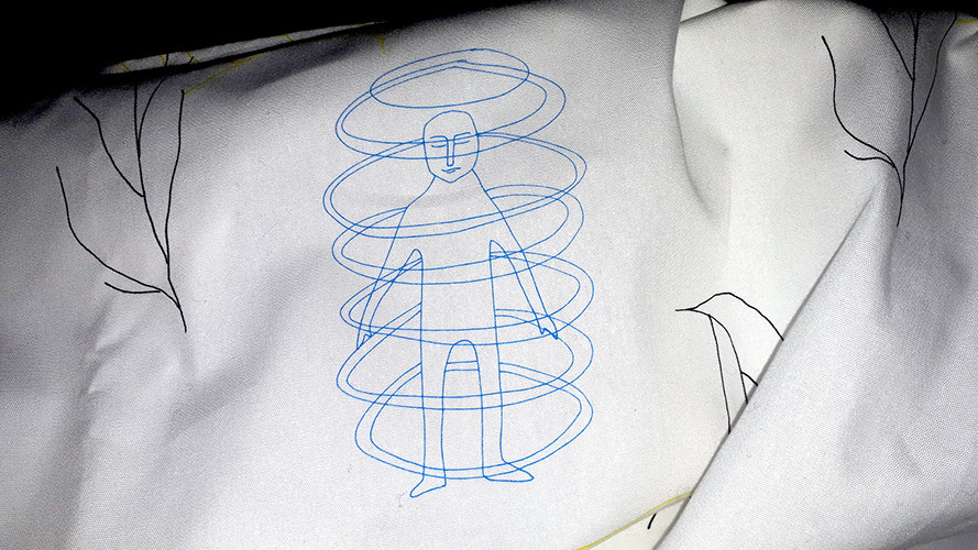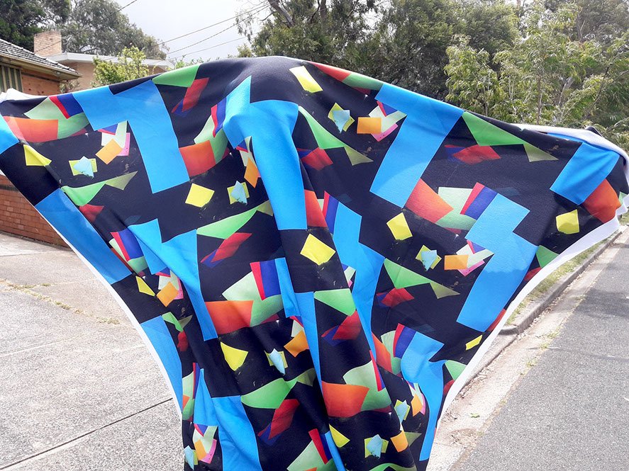 Commercially printed cotton/elastane cloth, dimensions variable. With graphic design support from Christian Ertel. Centered around ideas of loss, memory and haunting, Ghosting is a series of printed cloths that are both exhibited on their own, and shown covering figures in the videos. The cloth in the exhibition space is real and tactile; in the videos, it shrouds whoever is beneath it. Dreams and memories, both of the living and the dead, are the subject of the designs, but Ghosting also speaks to the ephemeral nature of photo and video recordings.